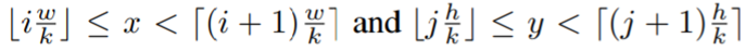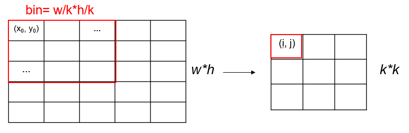 앞에서 object를 k*k 로 나눠줬었으니 pooling 결과도 k*k 로 나와야 한다. 각 RoI의 크기는 전부 다를테니 w*h 라고 하자. map의 하나의 cell에 매핑되는 RoI의 pixel영역들의 집합을 bin이라고 하면, bin의 크기는 w/k*h/k 가 된다. bin의 pixel들을 (x, y)라고 하면 각 (i, j)에 매핑될 픽셀들의 범위를 구할 수 있다.