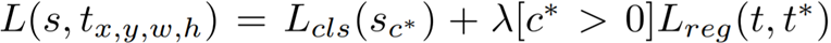 Loss Function은 기존의 다른 모델들과 다를 게 없다. Classification과 Regression의 loss의 합으로 이루어진다. 여기서 c*는 RoI의 Ground Truth 값, t*는 box의 Ground Truth값이고, c*=0은 background를 의미하기 때문에 regression은 background를 제외하고 계산해준다.