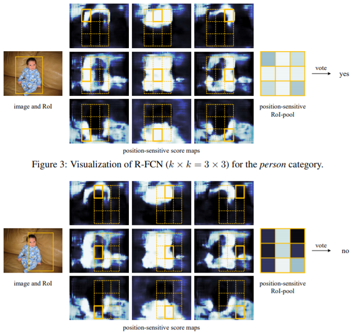 이제 이 score map이 어떻게 활용되는지 봐야할텐데, model이 그림의 두 가지 경우의 RoI를 만들었다고 하면, 첫 번째 그림은 object의 위치가 feature맵에서 흰 부분과 많이 겹치지만 두번째는 아닌걸 볼 수 있다. 예를 들면 아기의 손 부분은 실제 object의 손이 위치하는 부분에서 아예 벗어났기 때문에 거의 까맣게 나오는 걸 볼 수 있다. 이렇게 각 부분별로 계산해서 구하기 위해 도입한 게 Position-sensitive RoI Pooling layer이다.