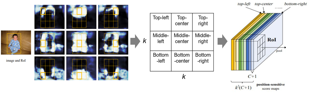 object가 존재하는 영역을 k*k의 grid로 나누어 각 총 k*k 개의 heatmap을 생성한다. 논문에서는 k=3으로 두는데 이 경우에는 Top-left부터 Bottom-right까지 총 9개로 나누어진다(생성되는 heatmap의 갯수와 분할한 object의 grid cell 개수가 같지만 헷갈리지 말자). 이 경우에는 대략적으로 Top-center에 아기의 얼굴이 들어가있겠다. 구분할 Class 갯수를 C라고 하면 background까지 포함해서 총 C+1 개에 대해 같은 방식으로 생성해준다. 다음 나눈 grid cell의 파트별로 (Top-left, Top-center...) 묶어서 차곡차곡 쌓아주면 총 k*k*(C+1) 의 dimension을 갖는 Score map이 생성된다.