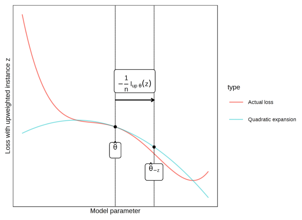 z를 삭제할 때 Loss가 정확하게 어떻게 계산될지는 그래프(Actual loss: 그림에서 붉은색 그래프)를 추정하기 어렵지만, 2차 확장(Quadratic expansion: 그림에서 민트색 그래프)을 형성하여 2차 근사치를 작성하고 Loss 추정