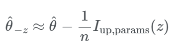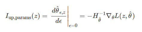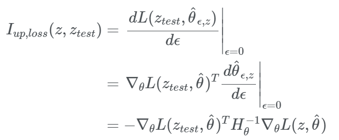 - 첫번째 줄 : Instance z의 가중치를 높여 계산된 새 parameter로 예측된 z(test)에 대한 Loss function의 변화를 통해 영향력 계산
