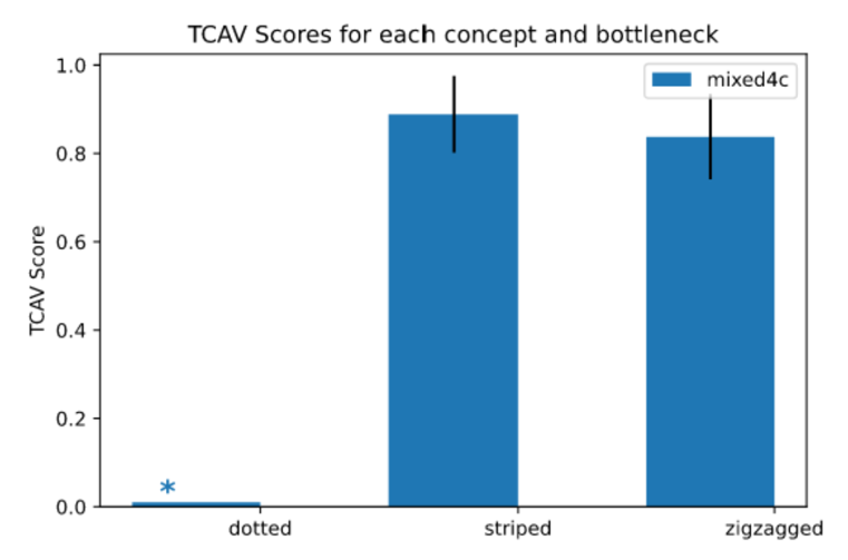 "striped", "zigzagged", "dotted"라는 concept에 대한 TCAV scores의 결과