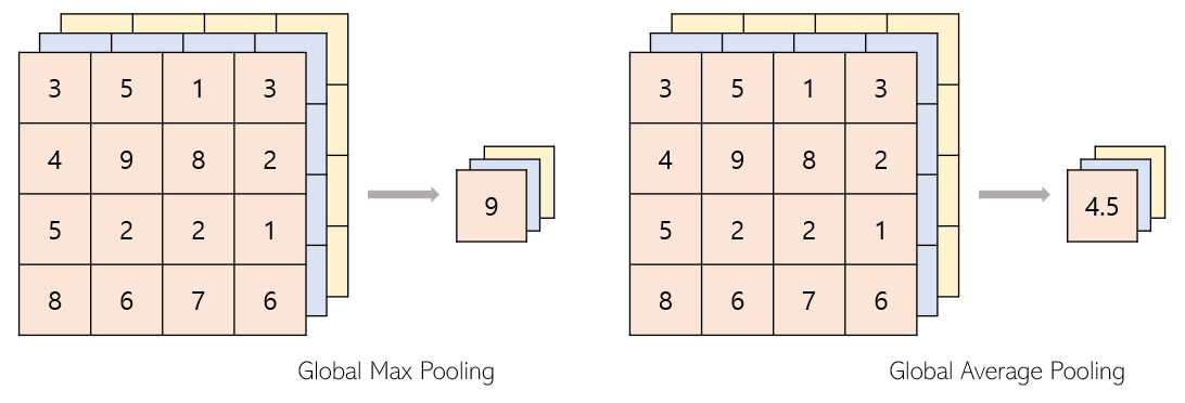 또, 전체 영역 내에서 가장 큰 값을 사용하는 방법을 Global Max Pooling(GMP)라고 하지만, 모든 값을 고려하여 평균값을 사용하는 방법을 Global Average Pooling(GAP)이라고 한다.