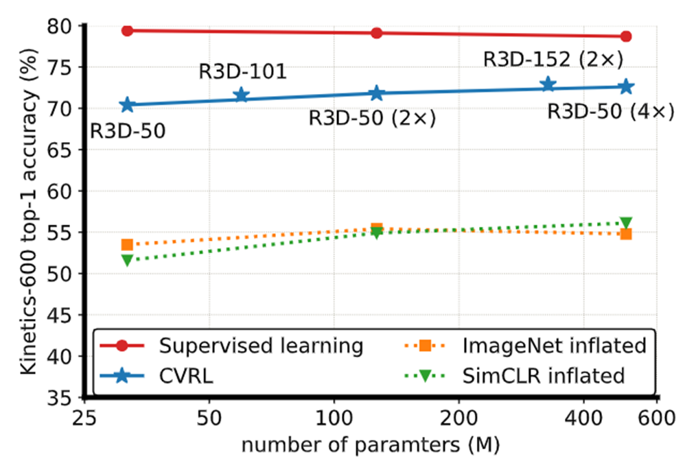 Kinetics-600 데이터셋에서 다양한 spatiotemporal representation method를 적용한 accuracy 비교이다. 기존에는 supervised와 unsupervised learning의 성능 차이가 현저하게 났었는데, CVRL이 unsupervised method들의 성능을 크게 뛰어 넘어서 supervised와 unsupervised사이의 gap을 많이 줄인 것을 볼 수 있다.