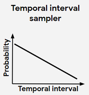 Temporal하게 가까울수록 probability가 높게, 멀수록 probability가 낮게 만들기 위해서 단조 감소 확률분포를 정의하고, 두 개의 clip의 start point 사이의 거리인 time interval t 를 이 분포 내에서 sampling한다.