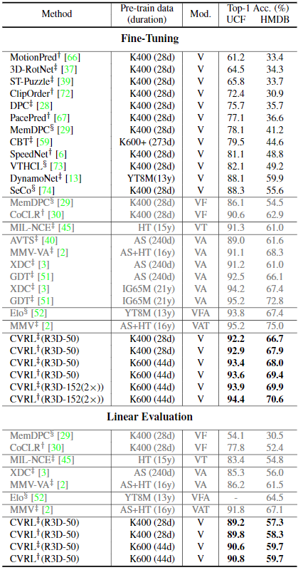 Label이 없이 학습하는 method들은 그 자체로 evaluation을 하기가 쉽지 않아서 subtask로 downstream하여 해당 성능을 평가하는 방식을 많이 사용하고 있다. Figure 10는 action classification subtask로 downstream해서 성능을 평가한 표이다.
