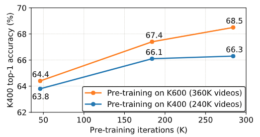 서로 다른 양의 video를 가지는 Kinetics-400과 Kinetics-600 데이터셋에 CVRL을 적용한 결과이다. CVRL은 데이터의 양이 많을수록 좋은 성능을 보인다고 한다.