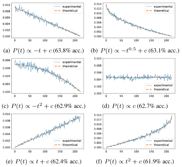 Sampling strategy에서 서로 다른 distribution을 사용했을 때의 성능 비교 결과이다. (a)와 같이 일정하게 감소하는 확률분포가 가장 높은 accuracy를 보였다.