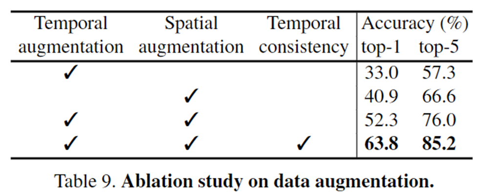 해당 논문에서는 video representation learning에서의 spatiotemporal augmentation 기법의 중요성에 대해 강조하고 있다. 실험적으로도 증명했는데, Figure 08에서와 같이 temporal, spatial augmentation을 모두 적용했을 때 accuracy가 가장 높게 나온 것을 볼 수 있다. Temporal consistency는 Step 2에서 적용한 방법을 나타낸다.