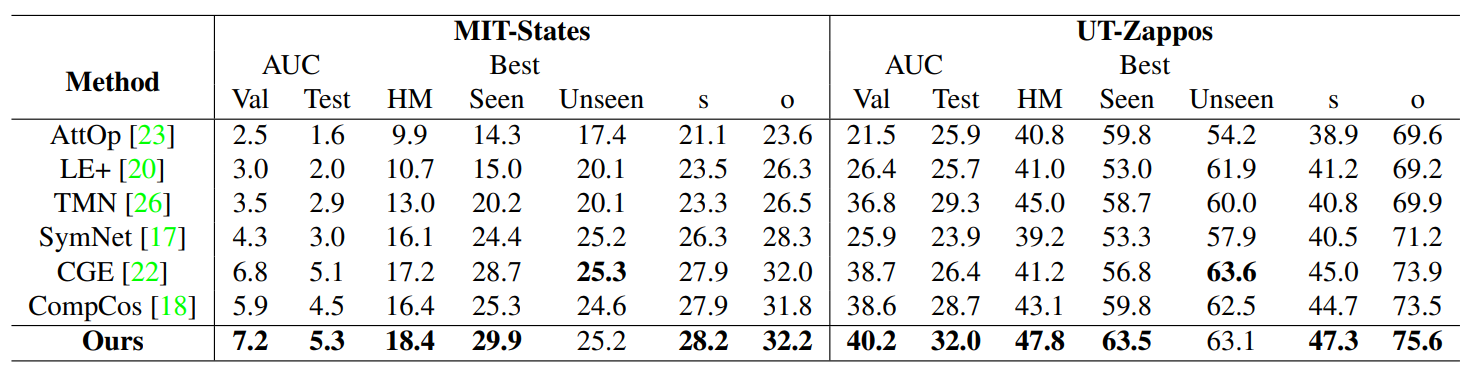 MIT-States 데이터셋에서 test AUC score를 기준으로 했을 때 기존의 SOTA인 5.1%를 뛰어넘는 5.3% (+0.2%)를 기록했으며, Harmonic Mean(HM) score를 기준으로 했을 때 18.4% (+1.2%)를 기록했다. State와 object 각각에 대한 예측의 accuracy로 보아도, 28.2% (+0.3%)와 32.2% (+0.4%)의 최고 성능을 보인다. 마찬가지로 UT-Zappos에서도 SOTA performance를 기록하였다.