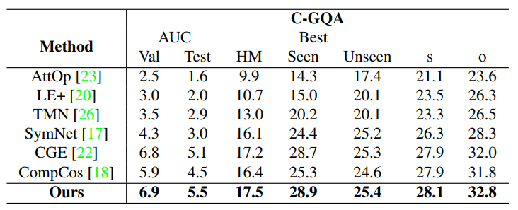 가장 최근 발표된 C-GQA 데이터셋에서도 AUC, HM, state/object accuracy 모두 향상된 결과를 보인다.