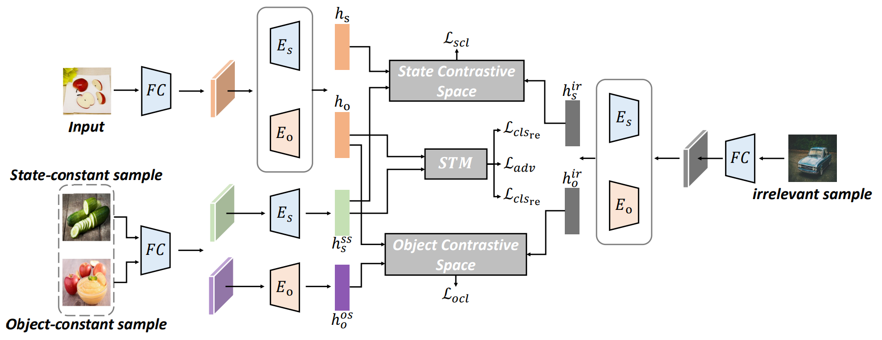 하나의 이미지가 feature extractor FC를 통과해서 얻은 visual feature $x$는, state/object 구성 요소로 분해하기 위해 두 개의 embedding으로 인코딩된다. State-specific Encoder $E_s$는 state를 잘 표현하기 위해, Object-specific Encoder $E_o$는 object를 잘 표현하기 위해 학습된다.
