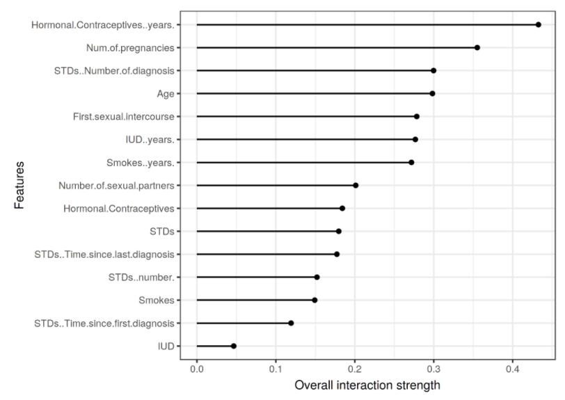 Example : 자궁경부암의 확률을 예측하는 Random Forest model의 H-statistic